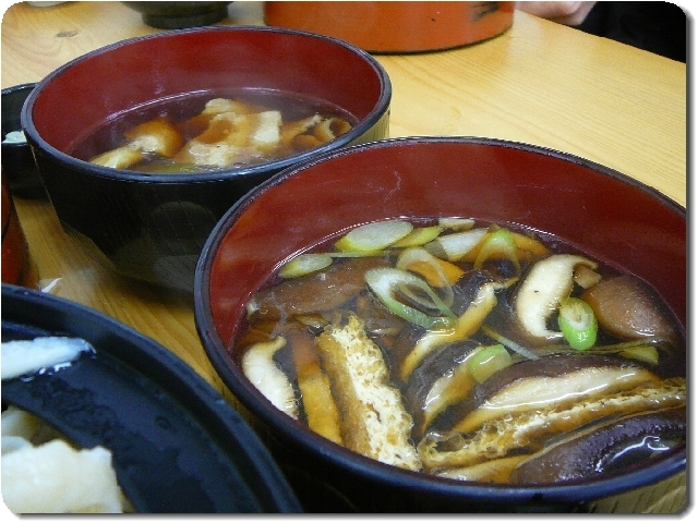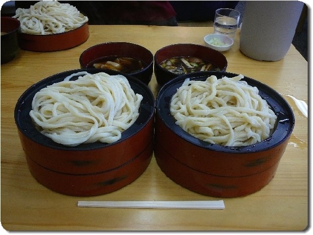 左 : u-1 大盛りうどん(なす汁) / 右 : M もりうどん(きのこ汁)